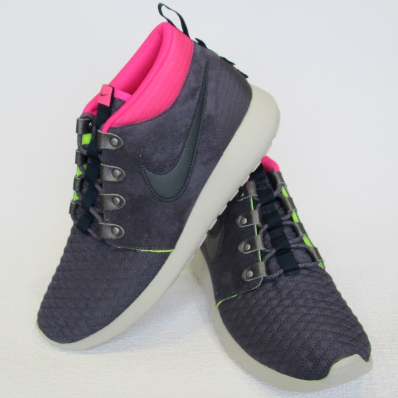 Ботинки NIKE Roshe Run Sneakerboot темнофиолетово-синего цвета с неоново-розовыми вставками на серой подошве. Очень стильные и современные. Теплый выстеганный материал нейлона на носке с переходом такого же цвета в замшу, дополненные фирменным знаком NIKE сбоку ботинок. Резиновая вафельная подошва из вспененного материала обеспечивает легкую амортизацию. Все детали удобны. Шнурки для пригонки, петли на пятке и язычке для удобства одевания.